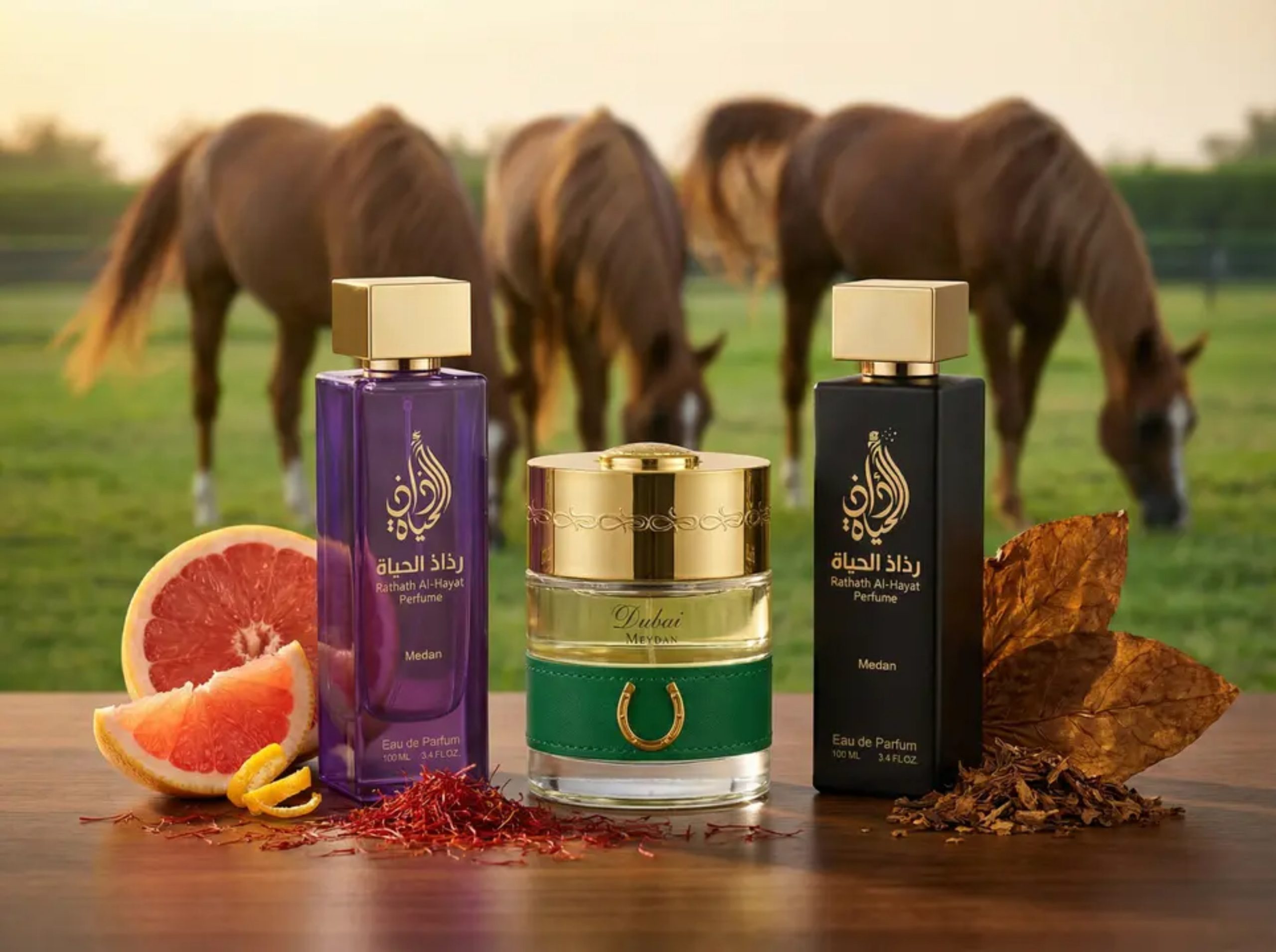 A luxurious oriental unisex fragrance that combines fresh opening notes (grapefruit, saffron, bergamot, lavender) with a rich heart of tobacco, oud, cedarwood, and leather, and a warm base of musk, patchouli, amber, and vanilla, inspired by the elegance of Arabian horses and lush green fields.